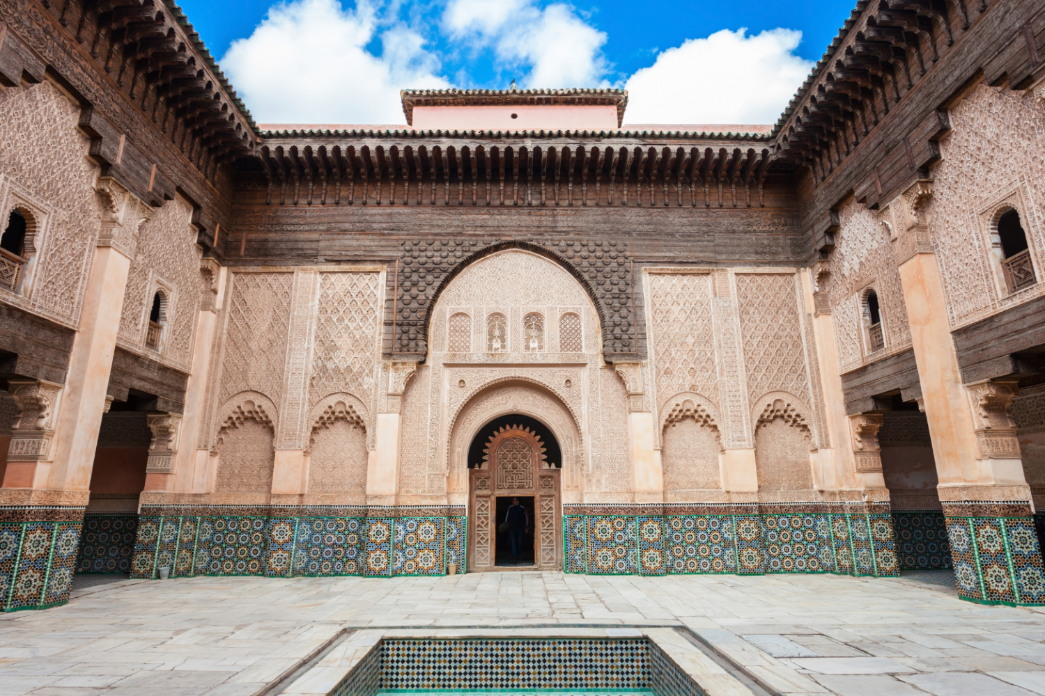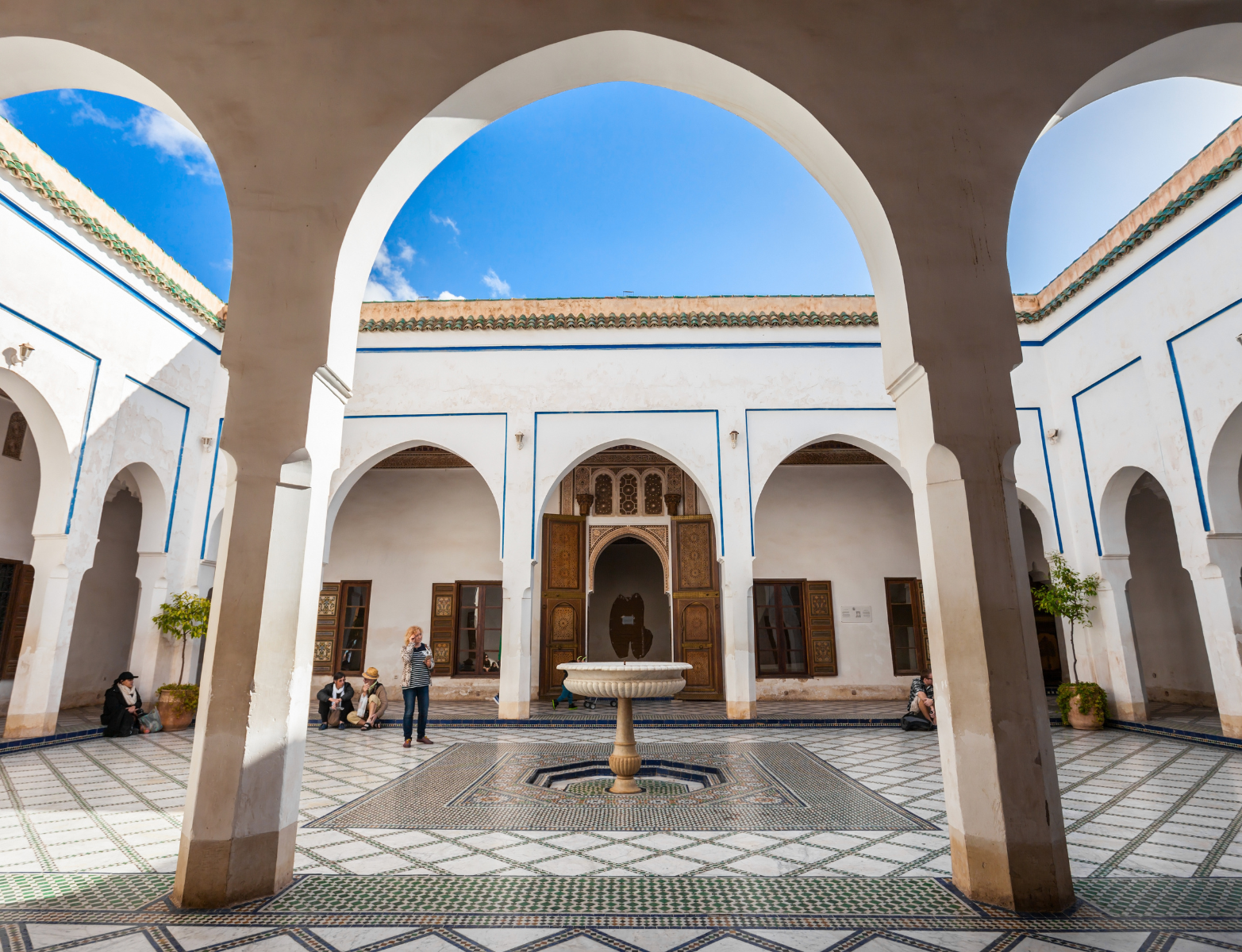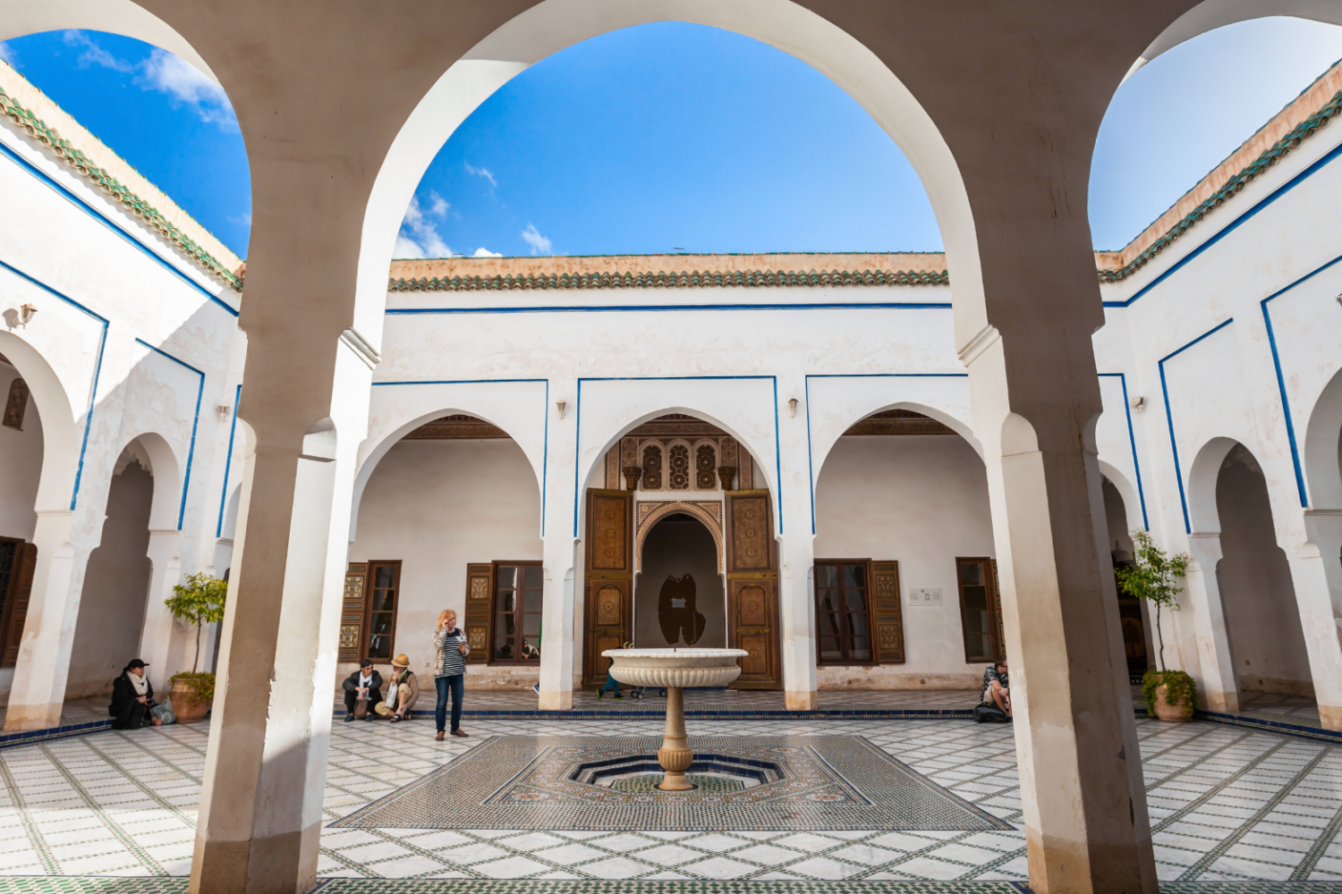 Next, we move on to the Bahia Palace, a 19th-century palace built by Si Moussa, the grand vizier of Marrakesh. The name “Bahia” means “brilliance,” and the palace lives up to this title with its stunning courtyards, elaborate mosaic floors, intricately carved stucco walls, and colorful painted ceilings. The palace was designed to accommodate Si Moussa’s family and showcase the wealth and artistic taste of Moroccan elite society. As you wander through the expansive gardens, inner courtyards, and grand reception rooms, you will notice the attention to detail in every corner, from delicate archways to ornate fountains. Our guide will provide context about the palace’s history, its significance during the Moroccan sultanate, and the lives of the people who inhabited it, making your visit a comprehensive cultural experience.