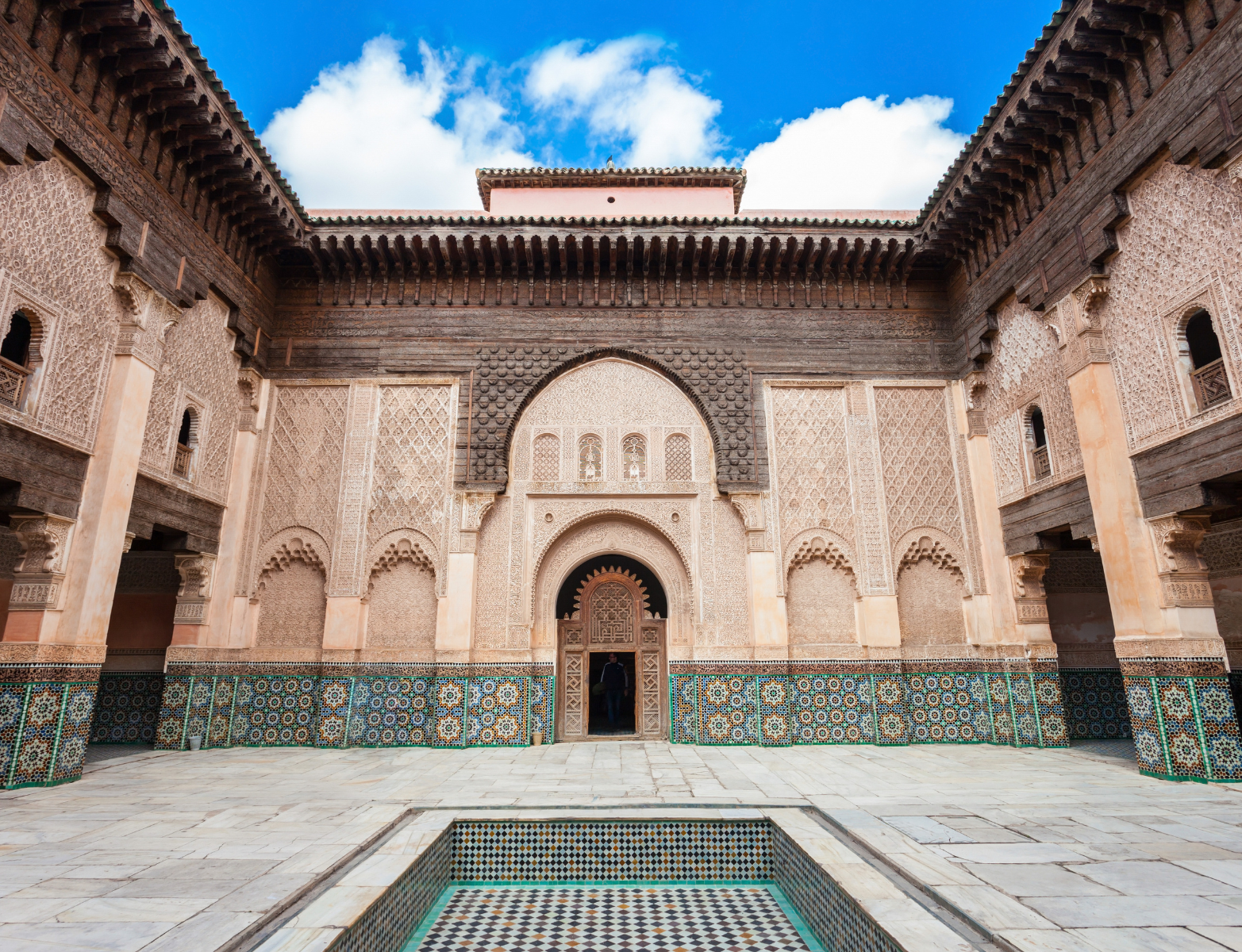 Continuing our morning tour, we visit the Ben Youssef Madrasa, one of the largest and most beautiful Islamic schools in North Africa. This madrasa, built in the 14th century and expanded over time, is famous for its intricately carved cedar wood, finely detailed plasterwork, and stunning zellij tile mosaics. The central courtyard, surrounded by student rooms and prayer halls, reflects the harmony and symmetry typical of Islamic architecture. Here, you will gain insight into the historical education system in Morocco, where students from across the region came to study theology, law, and language. Our guide will share stories of the madrasa’s history, its role in Moroccan scholarship, and the cultural significance of Islamic education, providing a rich educational and visual experience.